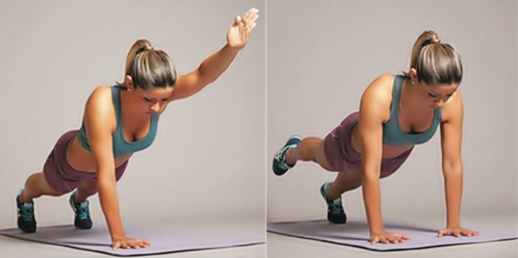 Em quatro apoios (cotovelos e joelhos no chão), flexione uma das pernas e eleve-a até ultrapassar a linha do quadril. Volte sem deixar que o joelho toque no chão. Realize 20 repetições e no final, repita o movimento com a outra perna.