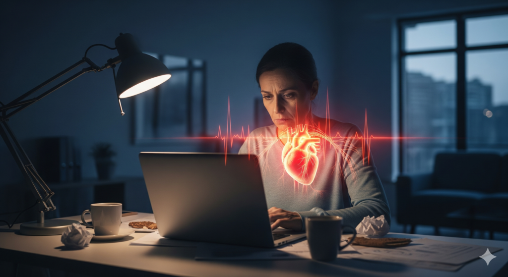 O sistema cardiovascular é uma das maiores vítimas. Sob tensão constante, a pressão arterial sobe e os batimentos cardíacos aceleram, forçando o músculo cardíaco a trabalhar dobrado. Além disso, o estresse crônico gera inflamação nas artérias.